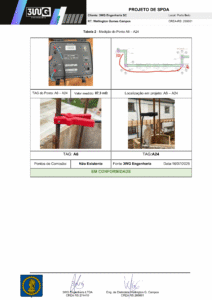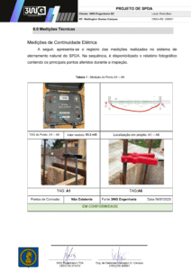 No documento, é possível observar que os dados coletados em campo são apresentados de forma clara e organizada, contendo informações como a identificação dos pontos de medição do SPDA, a localização precisa em planta baixa e o registro fotográfico das garras e conexões utilizadas durante as medições. Esses elementos garantem maior rastreabilidade, transparência e confiabilidade dos resultados, atendendo às exigências de boas práticas e conformidade técnica.