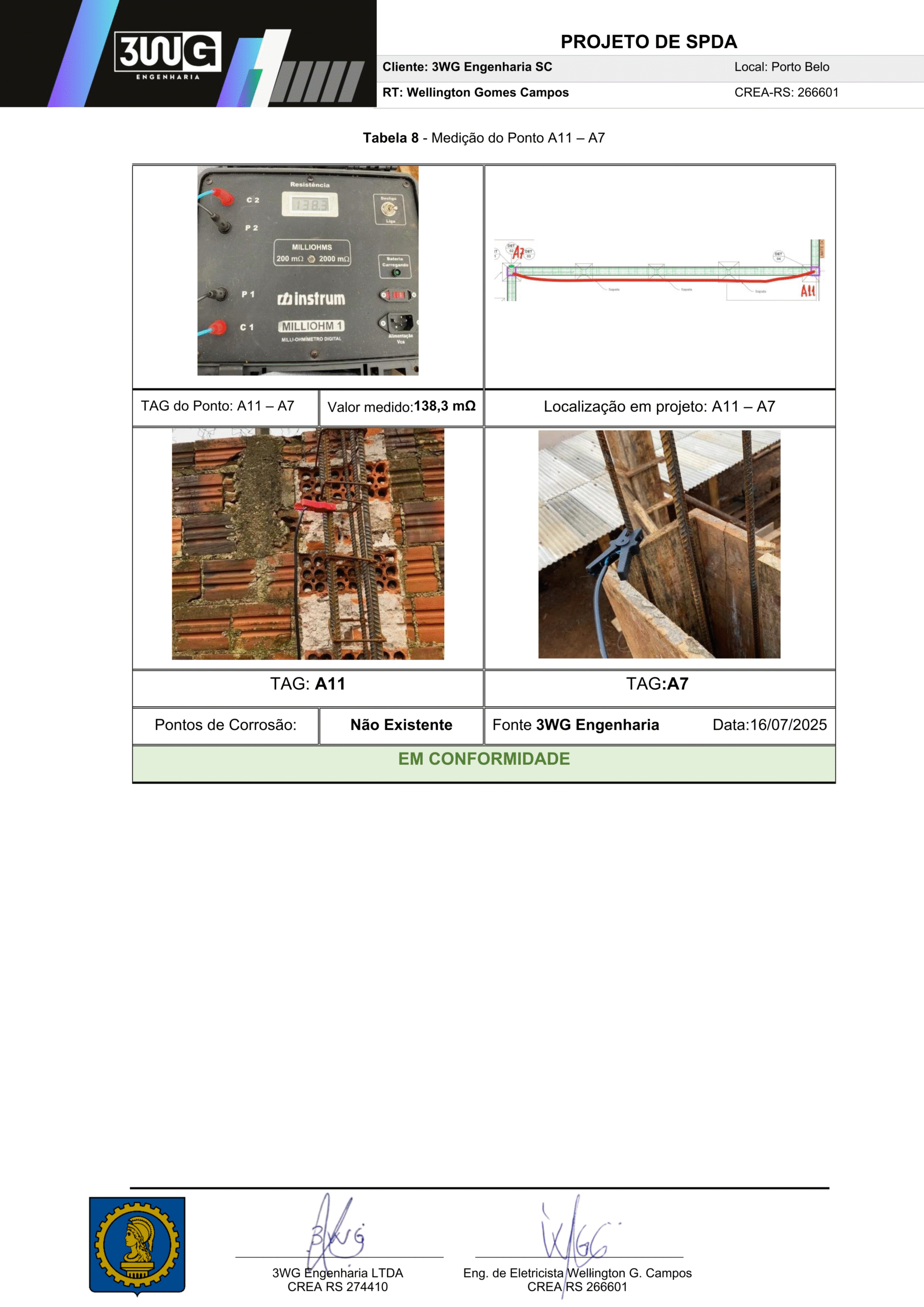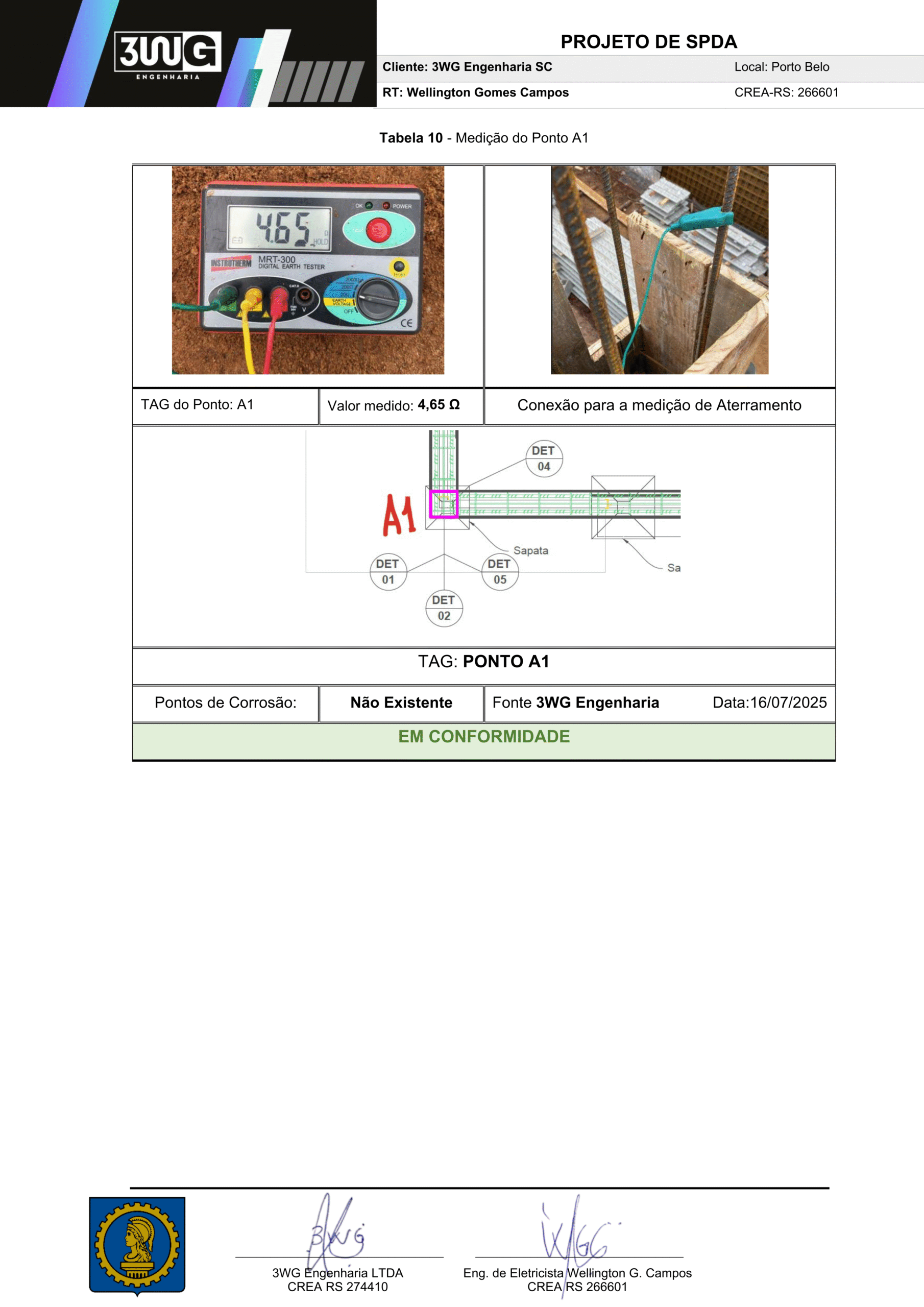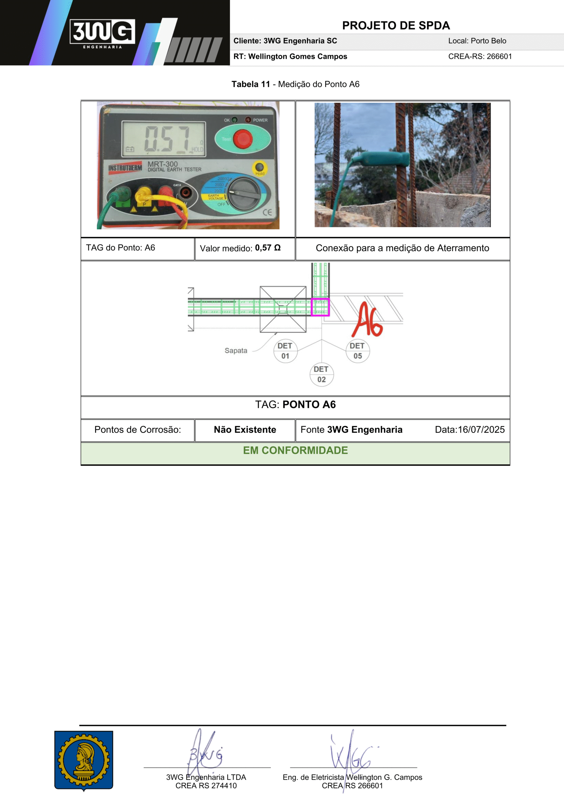 No documento, é possível observar que os dados coletados em campo são apresentados de forma clara e organizada, contendo informações como a identificação dos pontos de medição do SPDA, a localização precisa em planta baixa e o registro fotográfico das garras e conexões utilizadas durante as medições. Esses elementos garantem maior rastreabilidade, transparência e confiabilidade dos resultados, atendendo às exigências de boas práticas e conformidade técnica.