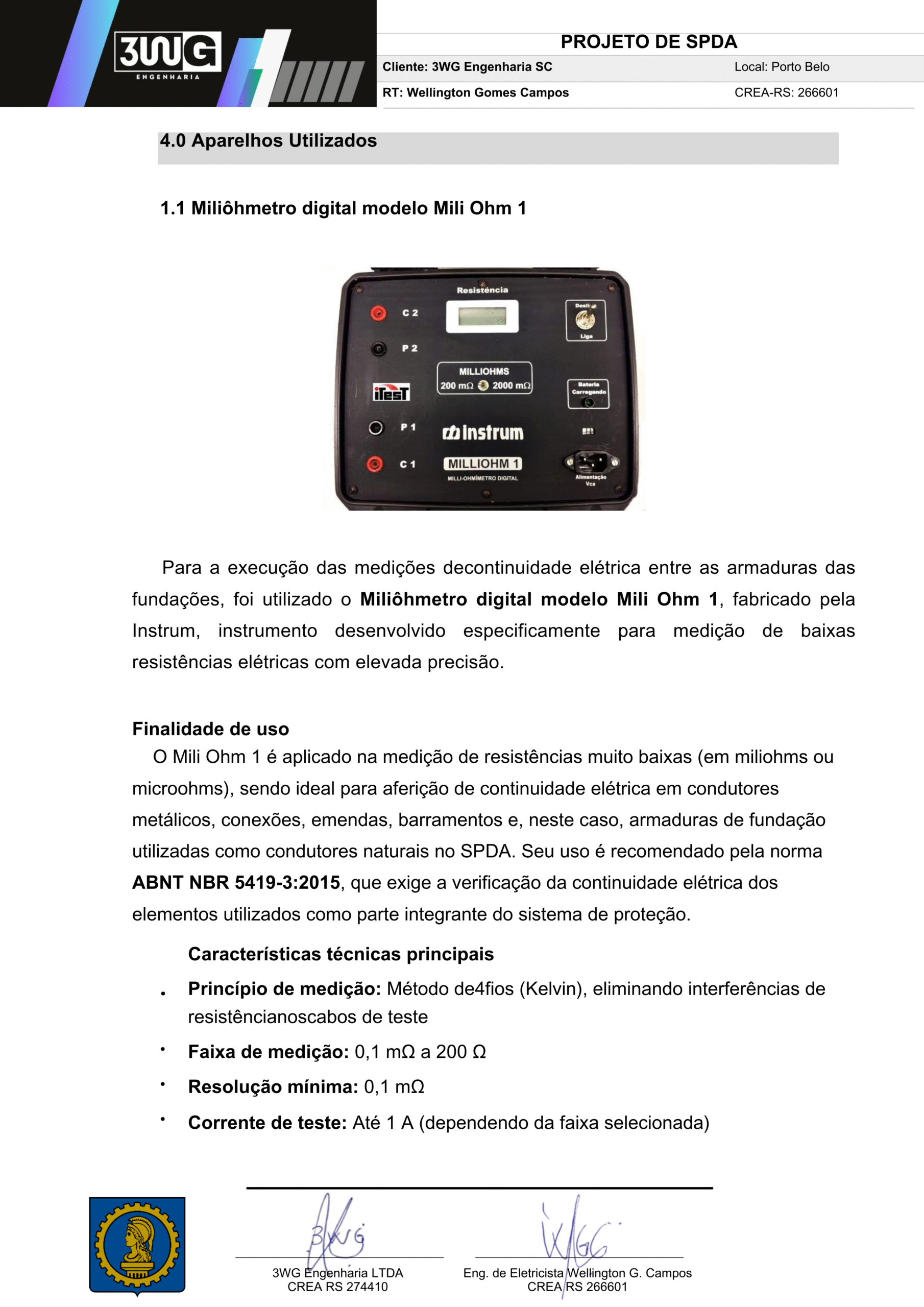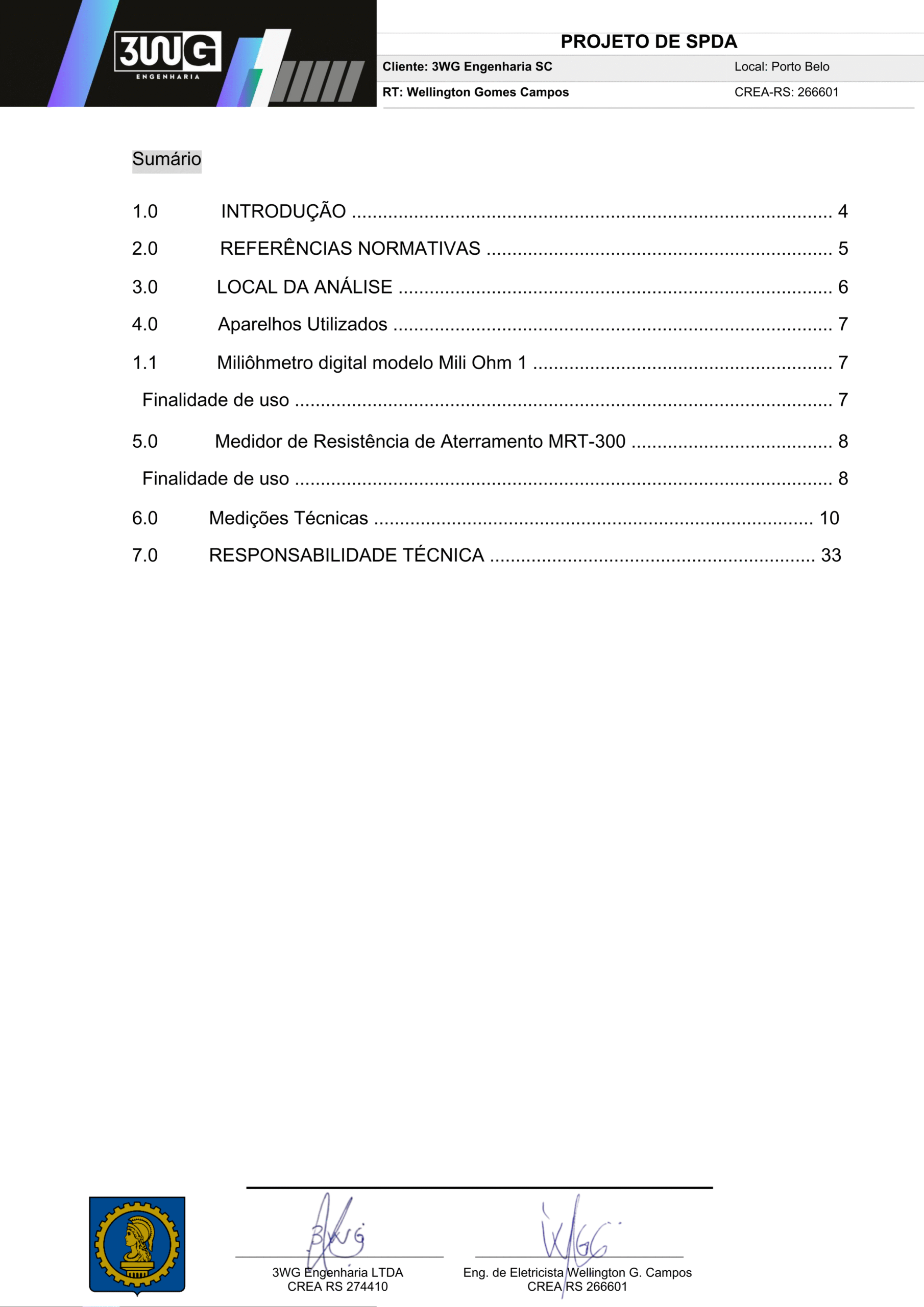 Ao lado, apresenta-se um documento exemplificativo que ilustra a estrutura completa de um laudo técnico de medição de continuidade e aterramento de um Sistema de Proteção contra Descargas Atmosféricas (SPDA). O material permite compreender, de forma geral, todas as etapas envolvidas no processo de elaboração do laudo, destacando os elementos essenciais exigidos pelas normas técnicas aplicáveis.